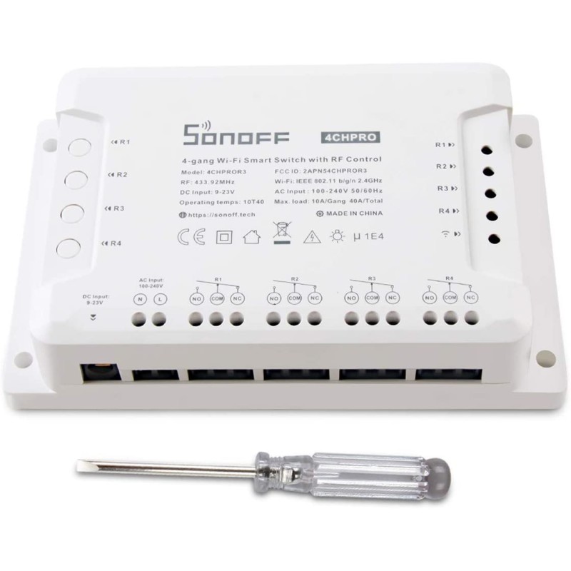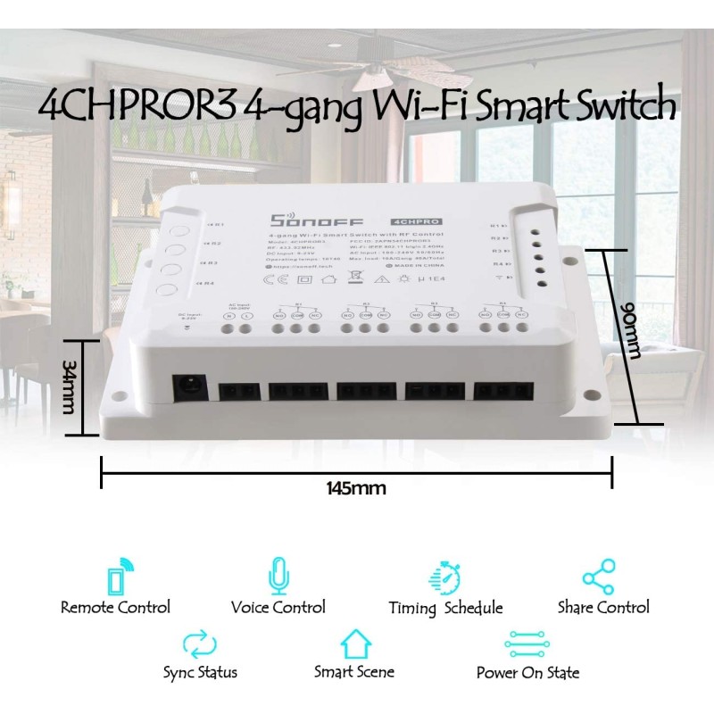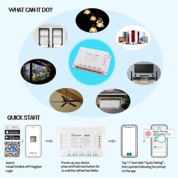 Remoto accendere/spegnere - Consente di accendere / spegnere 4 dispositivi elettrici tramite APP "eWeLink" da qualsiasi luogo. Telecomando: supporti controllati dal telecomando RF 433 MHz. Montaggio su guida DIN: ottimo per il controllo industriale.