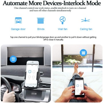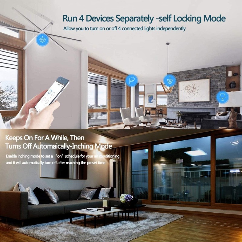 3 modalità di lavoro - Può essere impostato su APP "eWeLink". Controlla ogni gruppo separatamente in modalità autobloccante. In modalità interbloccante, gli utenti possono accendere un dispositivo ogni volta e spegnere altri dispositivi allo stesso tempo. In modalità intermittente per accendere 1 dispositivo collegato e poi spegnerlo automaticamente dopo un determinato tempo (0,5 - 3600s).